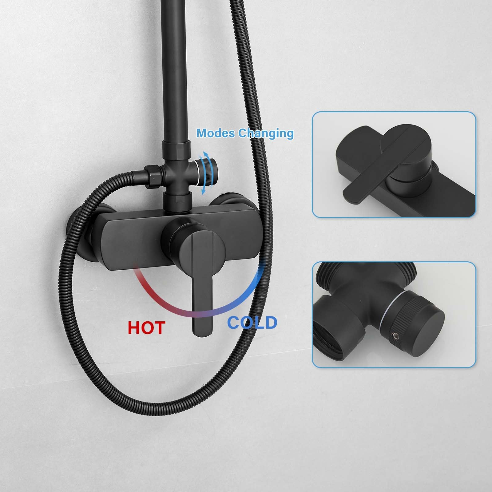 - ăComplete 2 Functions DesignăThis matte black exposed shower system with overhead rain shower head and handheld sprayer, meets all your shower needs. Functions switched by diverter, not available at the same time.