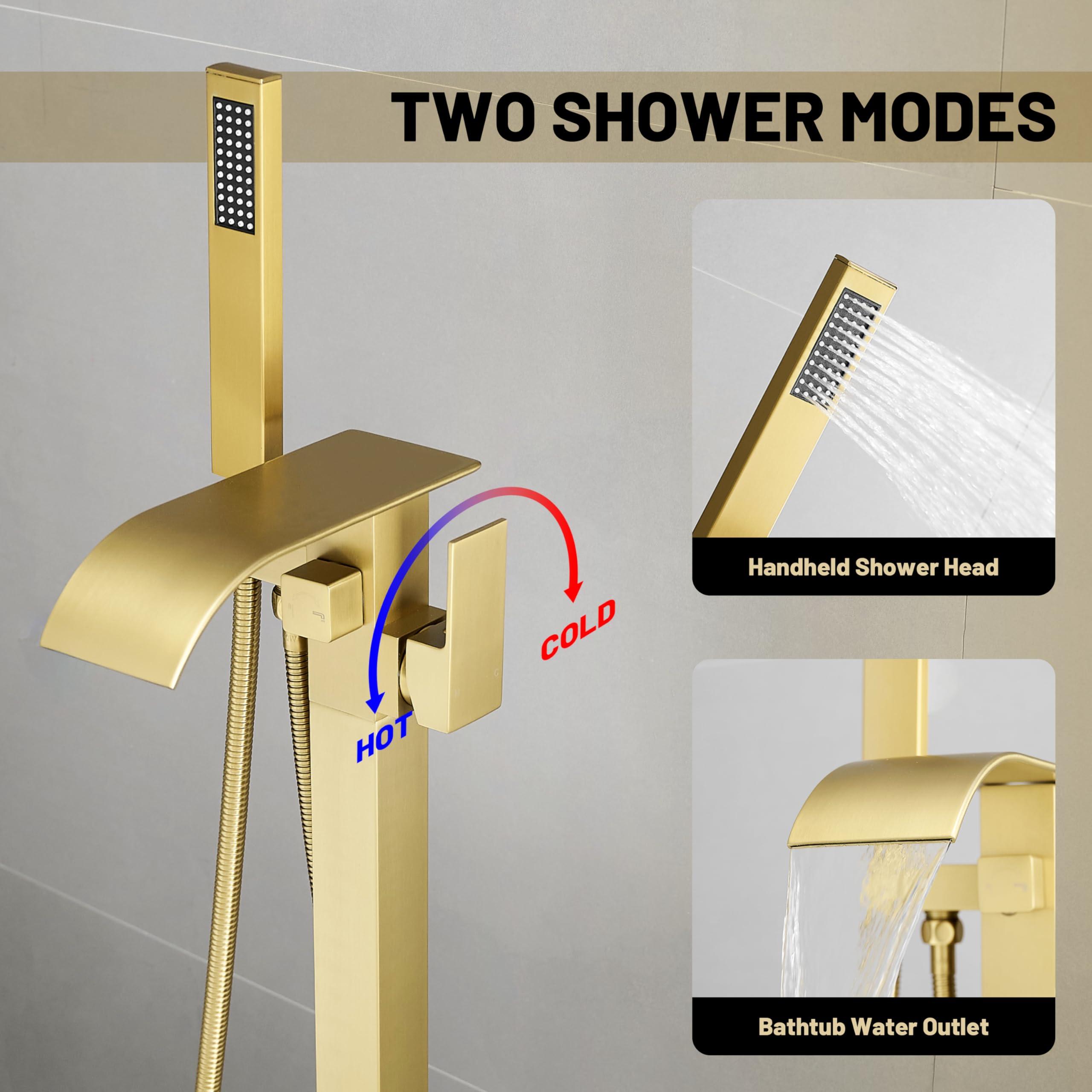 BWE Brushed Gold Freestanding Bathtub Faucet with Handheld Shower Head Single Handle Floor Mounted Tub Filler Waterfall Tub Spout Solid Brass Construction Bathtub System Brushed Gold