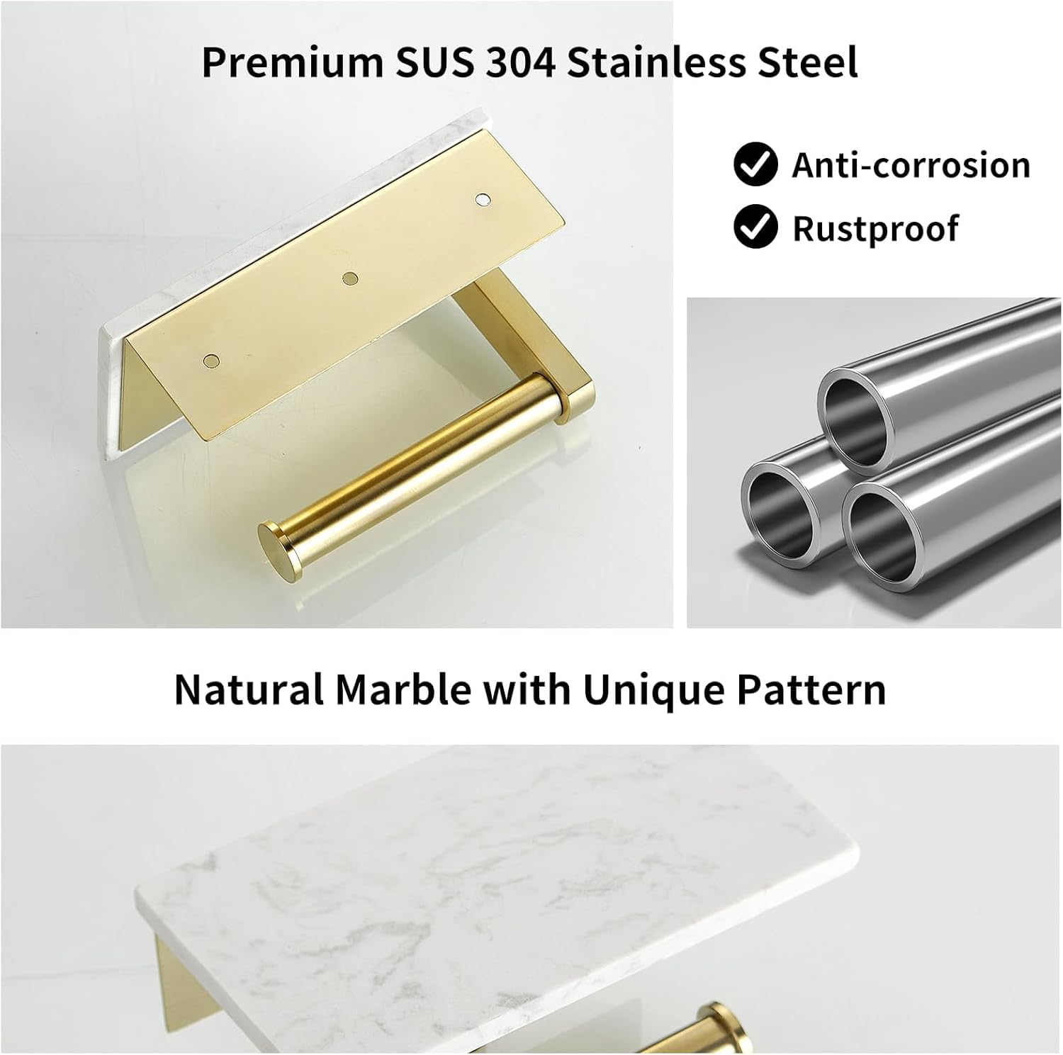 - Marble Toilet Paper Holder: This brushed gold paper towel holder features a modern design with unique marble, adding a touch of elegance to any bathroom. It also provides space for small items like phones, wipes, plants, or fragrances—combining style and functionality