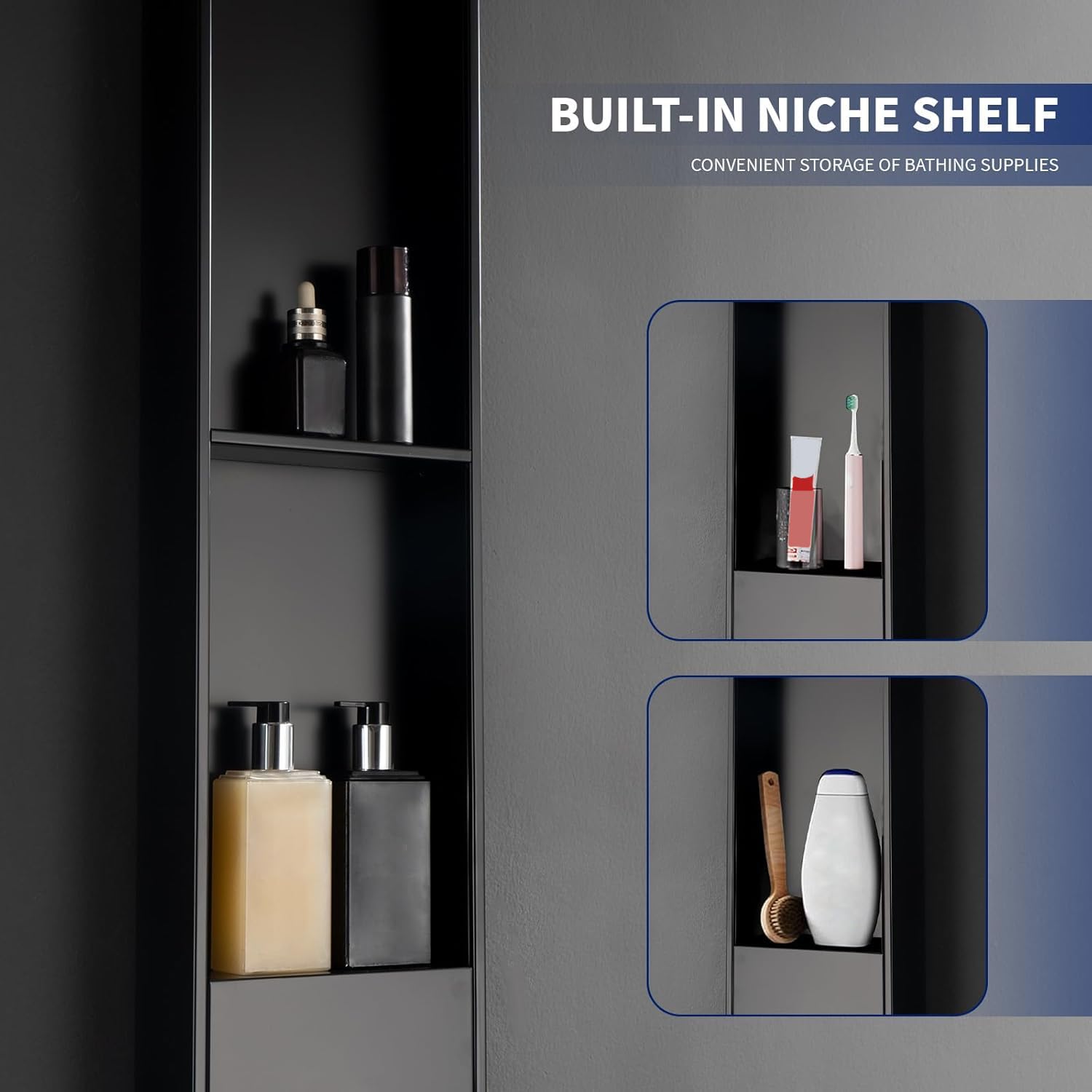 - ăConvenient shower nicheă The shower panel is equipped with a shower niche, which can be used as a storage space for placing toiletries and other items. Niche design can also effectively utilize bathroom space, making the bathroom look more tidy and orderly. The unique embedded design allows you to avoid the risk of shower products falling off