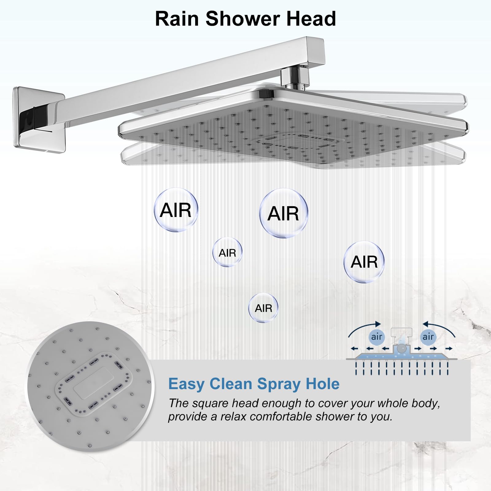 - Air Pressurization:With adoption of innovative air injection technology, the square raining sprinkler mixes water with air to increase the water pressure to 100%, and simulates the natural raining to provide you with natural contact of water experience.
