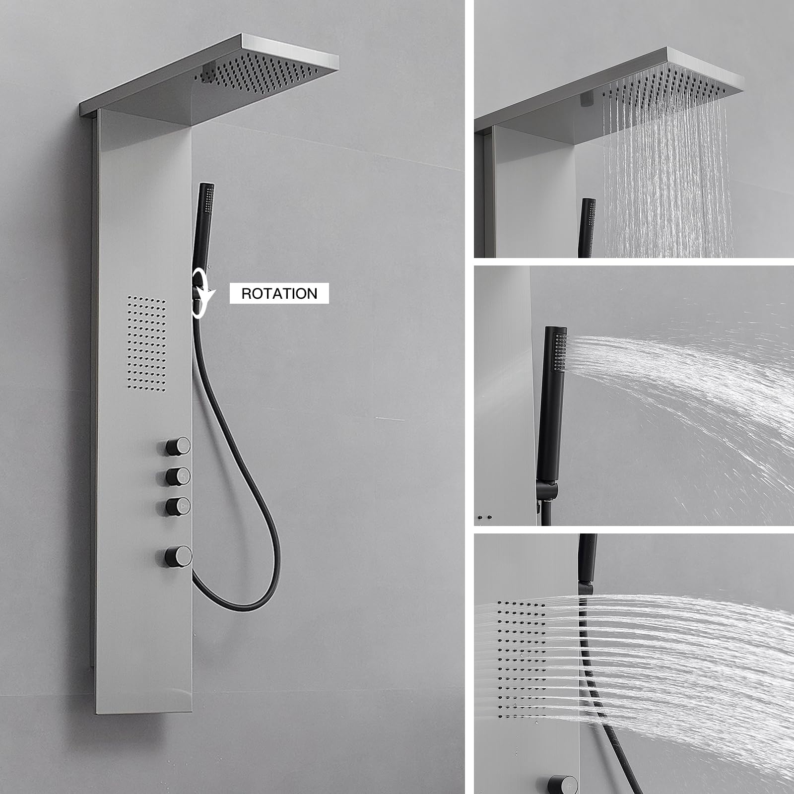 - ăMulti-Function Shower Panelă3-in-1 Shower panel system gives you the most comfortable shower experience.Rotate the top 3 shower knobs to change shower mode; 3 showers can run separately or simultaneously; Rotate the bottom knob to control water temperature and volume
