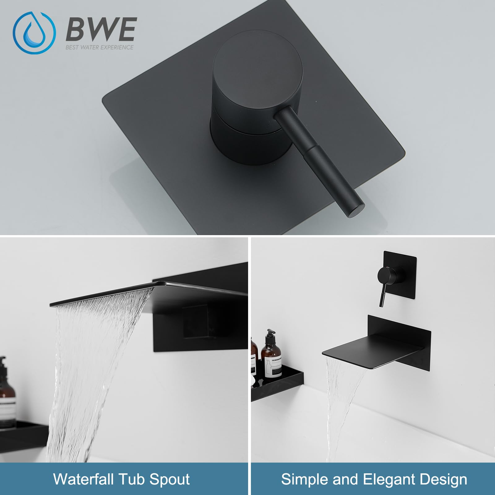 BWE Waterfall Tub Faucet Wall Mount Tub Filler Matte Black High Flow Brass Bathroom Bathtub Faucets with Single Handle
